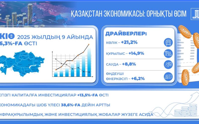2025 жылдың тоғыз айында ел экономикасының өсуі 6,3%-ды құрады. Бүгінде көлік, құрылыс, сауда және өнеркәсіп салалары экономиканың қозғаушы күшіне айналып отыр.