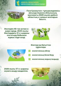 Ақмола облысында «Таза Қазақстан» тұжырымдамасы аясында 2029 жылға дейінгі өңірлік іс-қимыл жоспары бекітілді. Жоспарға 40-тан астам іс-шара енгізіліп, олардың басым бөлігі кезең-кезеңімен жүзеге асырылуда.