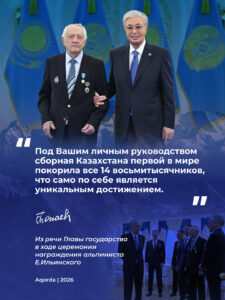 – Во многом благодаря Вашим колоссальным усилиям и высочайшему профессионализму небесно-голубой флаг Республики Казахстан гордо реял на самых, казалось бы, неприступных пиках планеты. Как опытнейший высотник, покоритель мировых вершин, победитель многих международных турниров, Вы снискали всемирную известность, совершили восхождение на Эверест и стали первым представителем Казахстана, вошедшим в престижный клуб «Семь вершин». Вы по праву пользуетесь признанием и уважением как основатель казахстанской школы альпинизма. Эта отечественная школа стала глобальным брендом нашей страны. Ваш талант тренера-наставника, требовательность и дисциплина стали основой воспитания целой плеяды выдающихся спортсменов-альпинистов, мировых рекордсменов и чемпионов, ставших элитой международного альпинистского движения. За время тренерской деятельности Вы подготовили более 100 мастеров спорта, среди Ваших учеников есть мастера спорта международного класса и даже заслуженные мастера спорта. Под Вашим личным руководством сборная Казахстана первой в мире покорила все 14 восьмитысячников, что само по себе является уникальным достижением. Заложенные Вами славные традиции альпинизма позволяют нашим спортсменам успешно выступать на многих международных соревнованиях, – сказал Президент